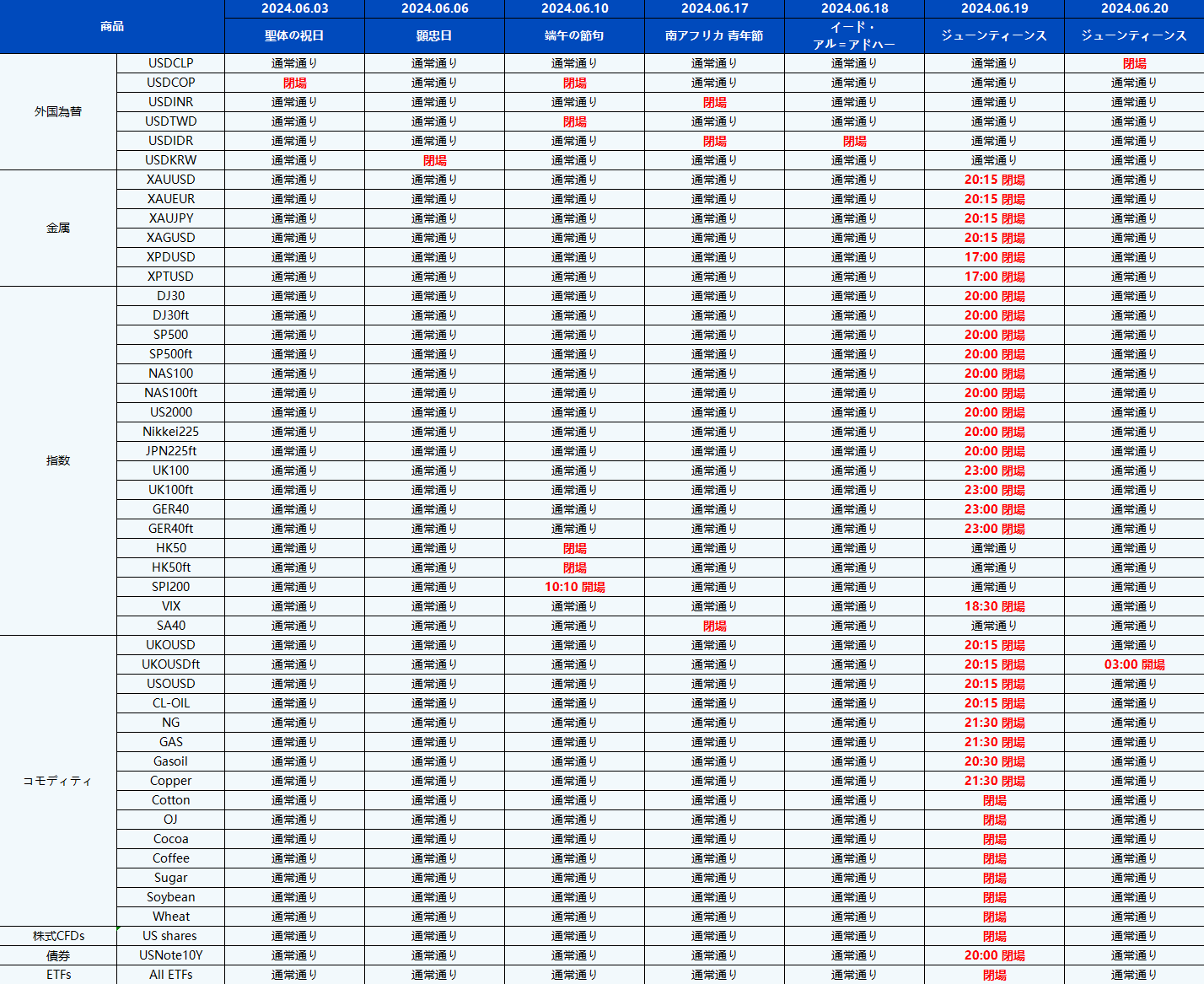 6月の連休に伴い、下記の商品の取引時間および立会時間が変更となります。